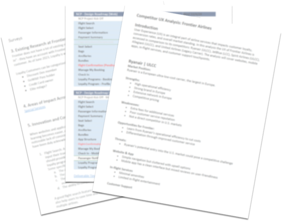 A major part of our process was constant competitive analysis. Airline websites and applications change daily, and it was a race to keep up with new features that our executive team wanted included in the roadmap based off what others were doing.